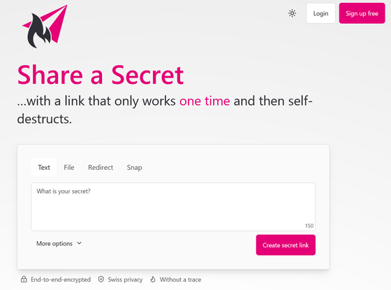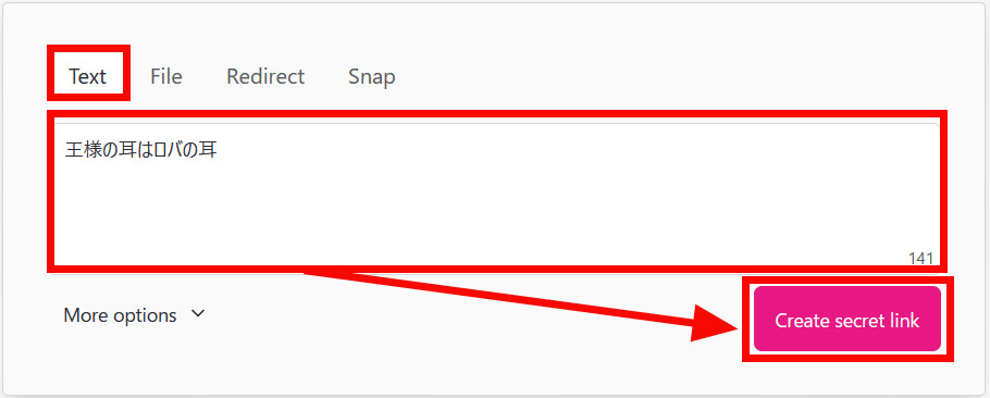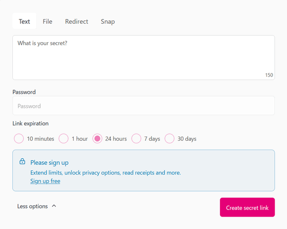 まずは秘密のテキストを共有してみます。サイトにアクセスしたら文章を入力して「Create secret link」をクリック。無料&非ログインで入力できるのは150文字までです。