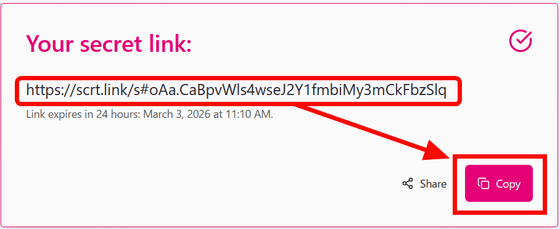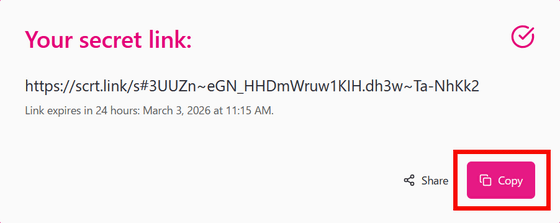 秘密の文章を共有するためのURLが生成されました。「Copy」をクリックしてURLをコピーします。
