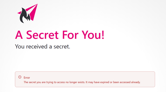 なお、同じURLに2回以上ログインすると、「この秘密はもう存在しません」と表示されました。URLで秘密が共有されるのは1回きりのため、誰かに秘密を伝えた後にURLが流出してしまった場合でも、秘密が流出してしまう心配はないというわけ。