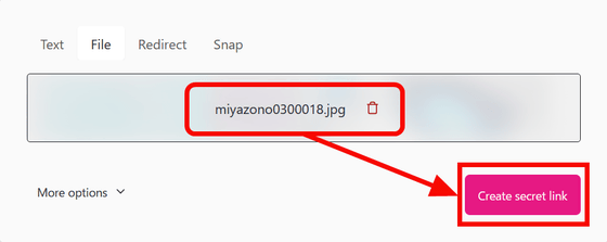 アップロードしたファイル名を確認したら「Create secret link」をクリックします。