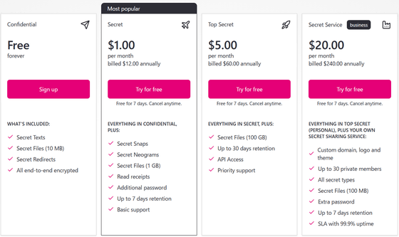 プランの価格表は以下の通り。無料ユーザーはテキストと10MB以下のファイルのみの共有が可能なほか、無料ユーザーとしてサインアップすると一度限りのリダイレクトを作成する「シークレットリダイレクト」を使用できます。月額1ドル(約156円)の「Secret」プランの場合はファイル共有より便利に1度限りの画像を共有する「シークレットスナップ」機能を使用できるほかファイルの共有は1GBまで可能で、開封確認やパスワード、URLの有効期限設定などが含まれます。月額5ドルの「Top Secret」プランではさらに100GBまでのファイルの共有とAPIアクセスが可能です。月額20ドルの「Secret Service」プランは最大30人のプライベートメンバーを設定できるビジネス向けプランとなっています。
