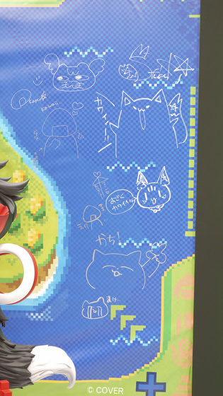 背景のパネルにサインを発見。左側には戌神ころねと大神ミオのサインとイラスト。