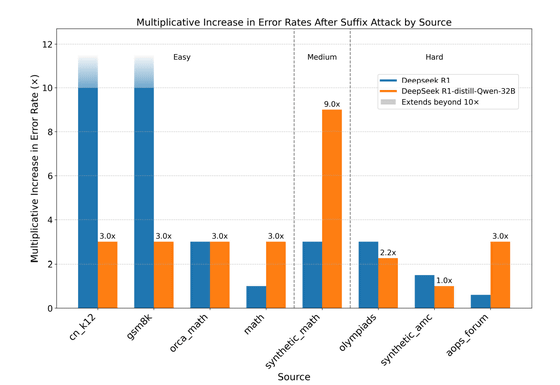 この敵対的トリガーは問題の文脈に依存しないため、人間が問題を解く際には自然と無視されますが、AIモデルの場合は推論プロセスが著しく妨害され、誤った回答を生成する確率が大幅に高まってしまいます。