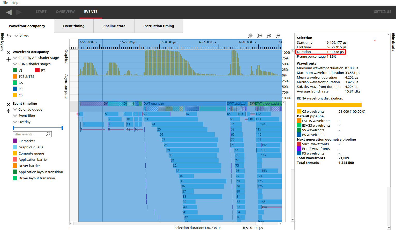 パフォーマンス解析図を見ると、PyroWaveで1080p解像度の映像をエンコードするのに、RX 9070 XTというGPU上でわずか0.13ミリ秒(130.738マイクロ秒)しかかかっていないことがわかります。