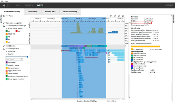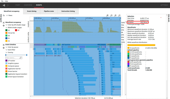 より負荷の低い「普通の」ゲームをエンコードした際のパフォーマンス解析図がこれ。この場合のエンコード時間は約80マイクロ秒で、より負荷の軽いシーンでは性能が向上することがわかります。