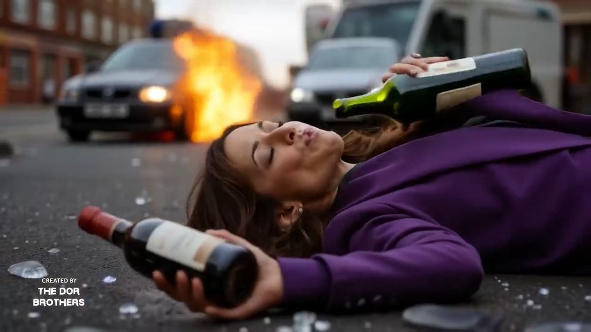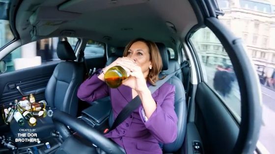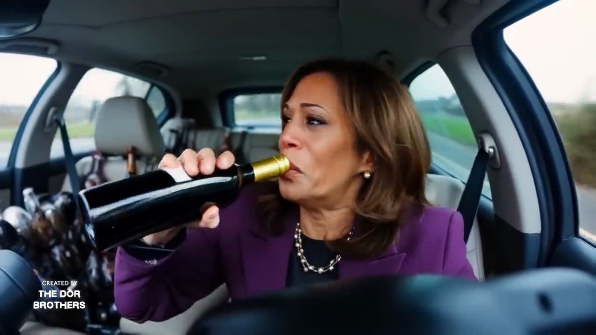 車を運転しながらワインをボトルから飲むカマラ・ハリス元副大統領。本物と見間違うようなディープフェイクというわけではなく、画面を見ればすぐにAI生成動画であることはわかります。