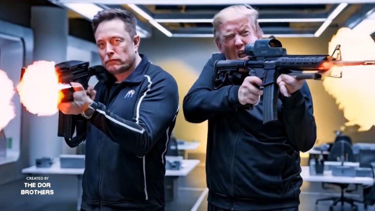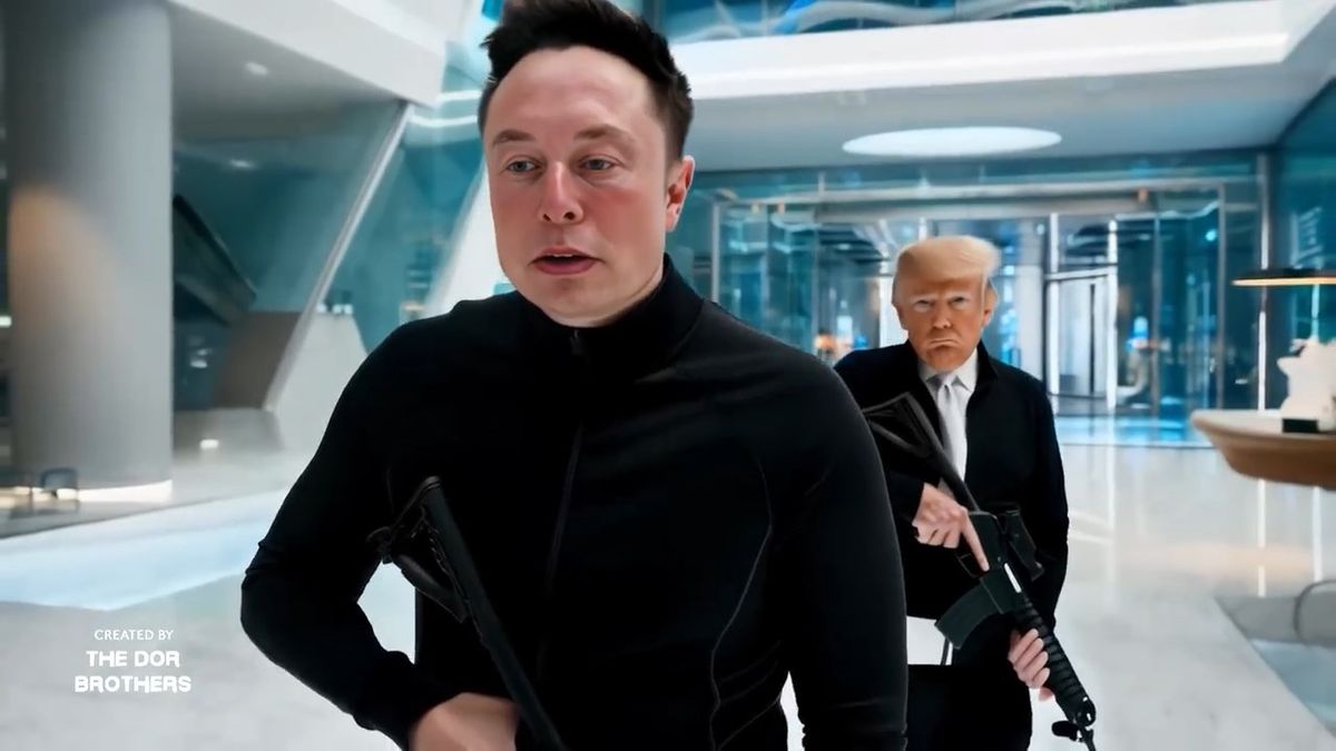 マスク氏とトランプ氏は銃を構えてどこかのビルに乗り込みます。