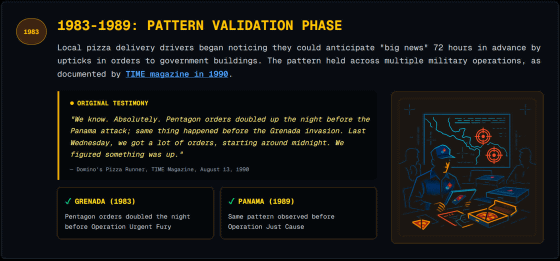 1983年~89年には地元のピザ配達ドライバーもこの傾向に気付き、大きな軍事作戦の最大72時間前に「ビッグニュース」を予測できることが知られ始めました。実際、1983年に起きたグレナダ侵攻や1989年のパナマ侵攻の前には、ペンタゴン近隣のピザ屋への注文が急増するパターンがみられたそうです。