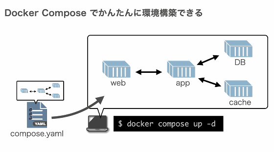 講座は「Dockerを用いることで、コマンド一発で環境構築できるようになる」といったDockerのメリットの解説から始まります。