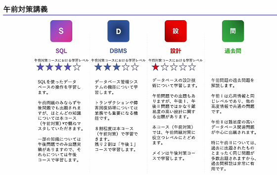 データベーススペシャリストの試験は午前と午後に分かれていて、「SQLの基礎知識」「データベース管理システム(DBMS)の機能」「データベースの設計技術」に関する問題が出題されます。本講座では、そのうち午前に出題される問題の解き方を学習できます。