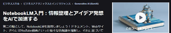 優秀な業務効率化ツールとして話題になっている「NotebookLM」の解説もあります。NotebookLMはウェブページ・PDFファイル・YouTube動画などの情報ソースを入力してAIに分析させられるウェブアプリです。この講座では「NotebookLMに企業情報を入力して分析させ、営業や就職活動に役立てる」といった実践的な使い方を学ぶことができます。
