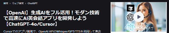 チャットAIや音声文字起こしAIなどを搭載したアプリが続々と登場しているほか、アプリ開発自体にもAIによるコード生成やエラー修正が活用されることが増えています。特に、AI機能を搭載したコードエディタ「Cursor」は従来のエディタと比べて開発速度を大幅に高速化できることから大きな支持を得ています。「【OpenAI】生成AIをフル活用!モダン技術で高速にAI英会話アプリを開発しよう【ChatGPT-4o/Cursor】」はCursorの使い方を説明するとともに、OpenAIのAIサービスを活用したアプリの開発手法も細かく解説してくれる講座です。