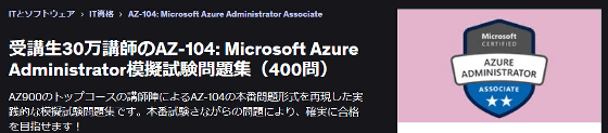 UdemyにはAZ-900の試験対策問題集や、より高難度な「Azure Administrator Associate (AZ-104)」の対策講座もラインナップされています。