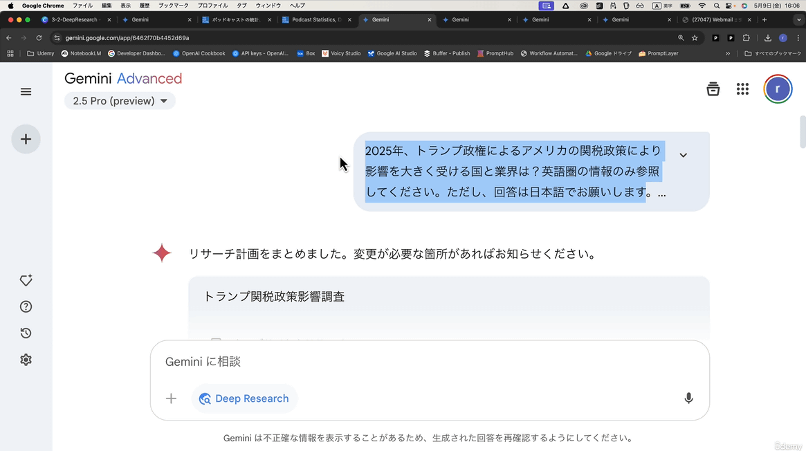 講座はGeminiの基本的な使い方の説明から始まり、Geminiを用いてインターネット上の情報を収集して詳細なレポートを作成できる「Deep Research」の活用方法も詳しく解説してくれます。使い方の説明だけでなく、「Geminiにトランプ関税に関するレポートを作成させる」といった業務に役立つ活用事例も確認できます。