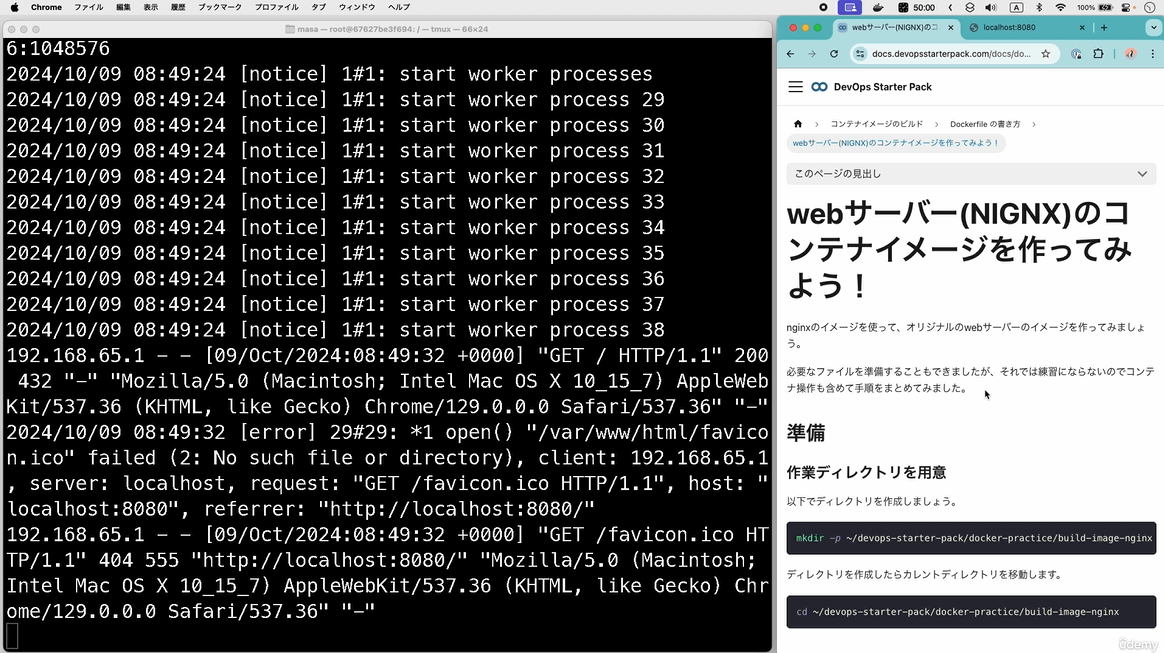ドキュメントサイトに記されたコマンドを使いつつ、「コンテナの起動・停止・削除」や「コンテナイメージの作成」といった操作の手順を学べます。解説動画だけでなくドキュメントサイトにも無期限にアクセス可能なので、学習した内容を簡単に再確認できます。