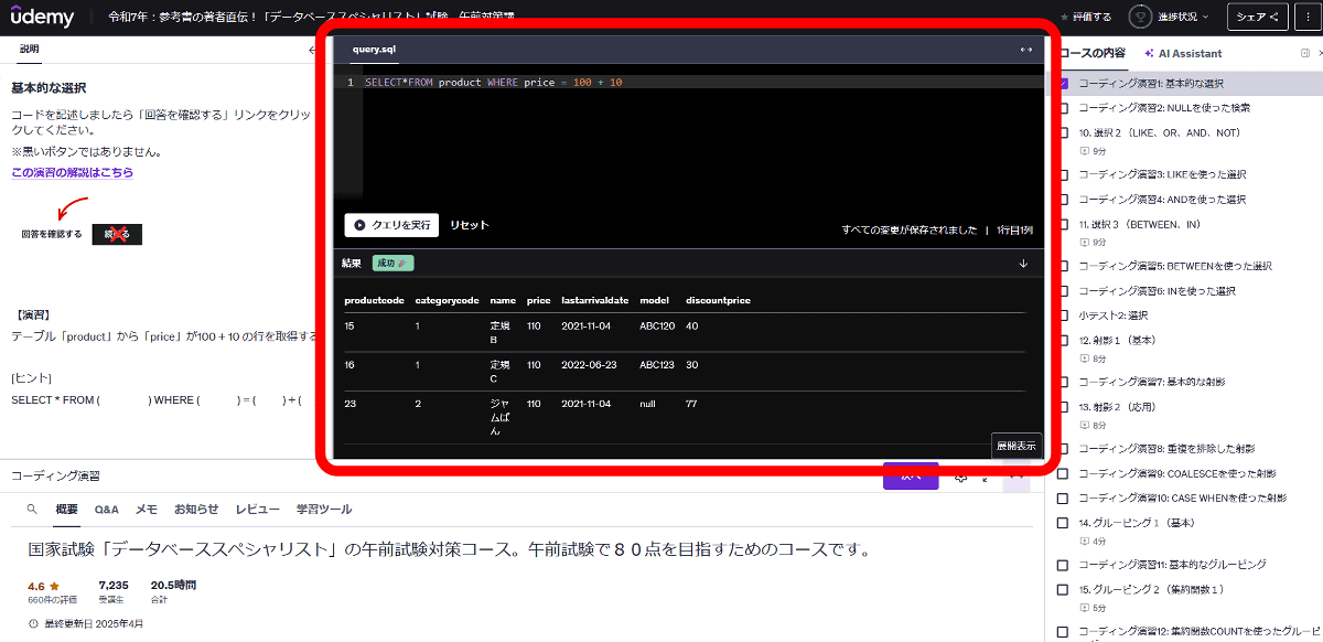 また、ブラウザ上でコードを書けるUdemyのコーディング演習機能を活用した演習問題も収録されているため、MySQLをインストールできない環境でも実際のコード入力を体験できます。
