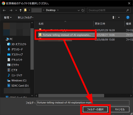 GitHubからダウンロードして解凍しておいた「Fortune-telling-instead-of-AI-explanation」のフォルダを選択して、「フォルダーの選択」をクリック。
