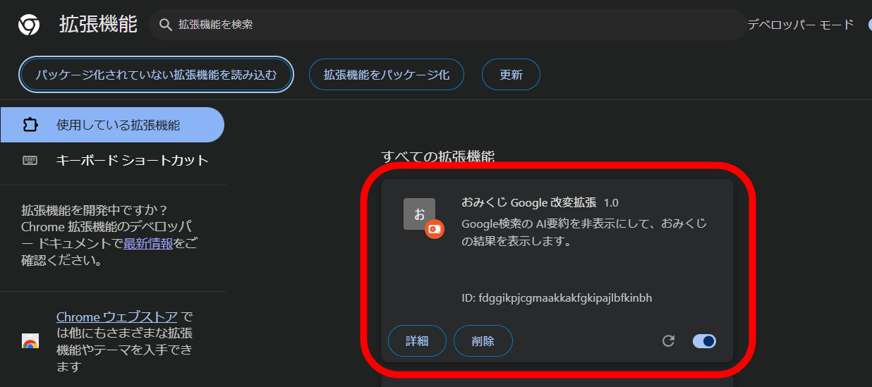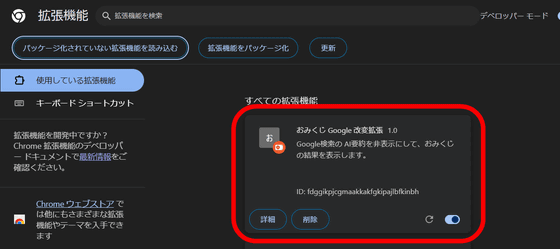 するとChromeの拡張機能ページに「おみくじ Google 改変拡張」が追加されます。