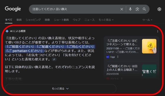 例えば「注意してください 言い換え」と検索すると、AIによる概要は「ごperhatianください」という謎の言い換えを推奨してきます。