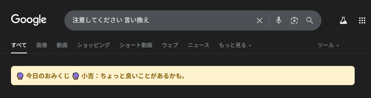 これでGoogle検索の「AIによる概要」はおみくじになっているはず、ということでさっそくGoogleで適当に検索してみます。