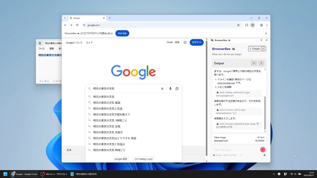 後は、画面右下の入力欄にAIへの指示を入力して送信ボタンをクリックすれば、ブラウザを自動操作してタスクを実行してくれます。今回は「明日の東京と大阪の天気を調べて表にまとめて」と入力しました。
