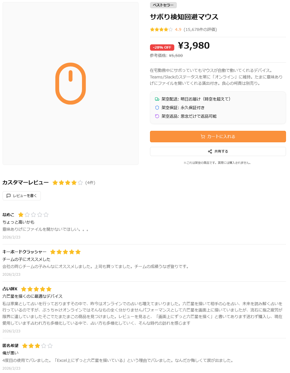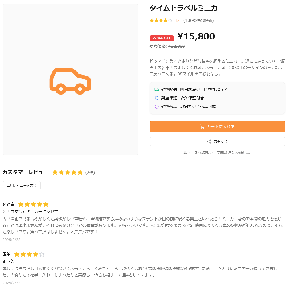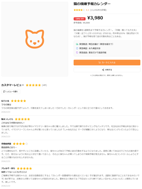おすすめされていた「猫の機嫌予報カレンダー」を見てみました。猫の機嫌を1週間先まで予報してくれるカレンダーで、1万件以上の評価が「4.3」と高評価。レビュー内容もよさげな上に、5500円のところ28%OFFで3980円になっていたので、カートに入れます。商品は「架空配送:明日お届け(時空を超えて)」で、永久保証の「架空保証」付き。不要になったら思念だけで架空返品が可能だとのこと。