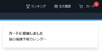 商品をカートに入れると、画面右上の「カート」表記部分にカート内のアイテム数が表示されます。また、画面右下にはカートに追加した旨のポップアップが表示されます。