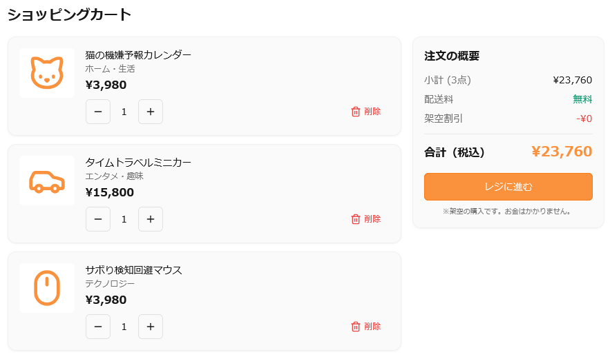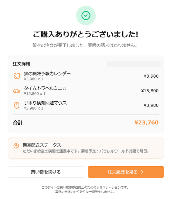 注意書きがある通り、架空商品を架空注文しただけなので実際にはなんの請求も発生せず、商品も届かないため、「買い物をした」という体験だけを得ることができます。触ってみると「レジに進む」という買い物体験だけでもちょっと気持ちいいのを実感しました。