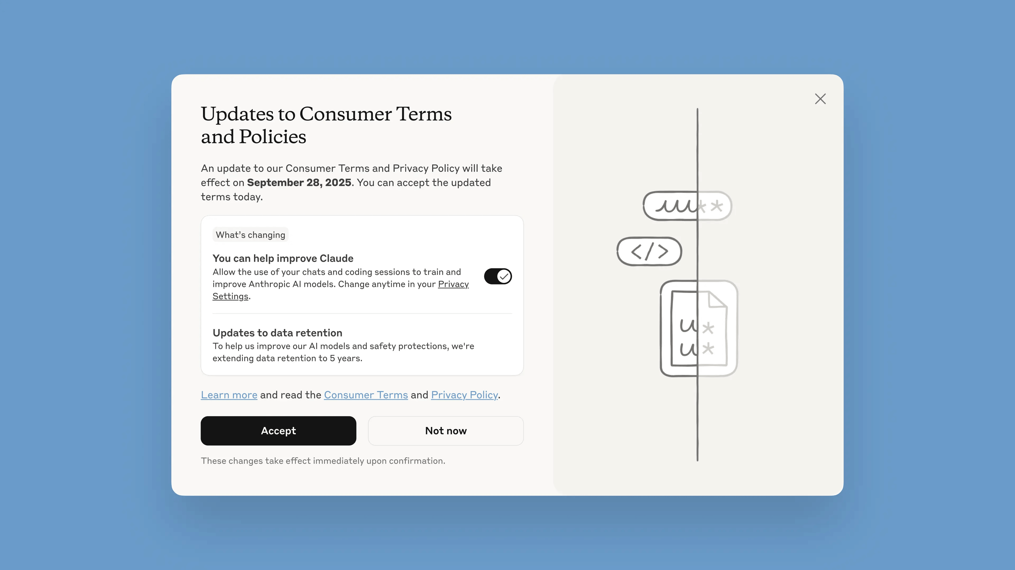 新しい消費者利用規約およびプライバシーポリシーは2025年9月28日に発効予定ですが、記事作成時点ですでに同意可能で、同意した場合は即座に有効になります。なお、新たらしい消費者利用規約およびプライバシーポリシーは新規または再開されたチャットおよびコーディングセッションにのみ適用され、過去のやり取りには適用されません。