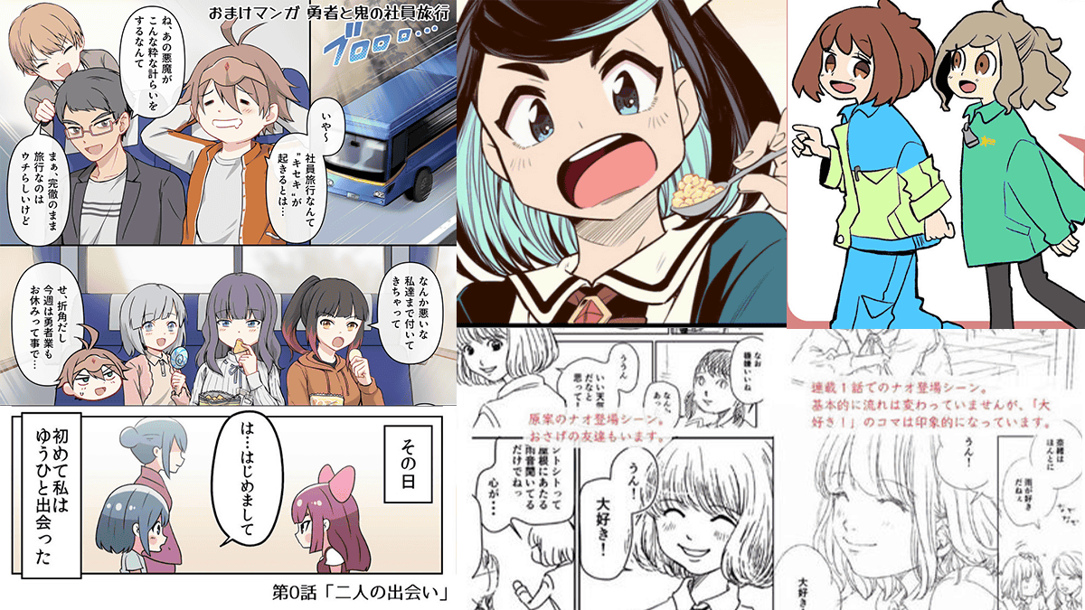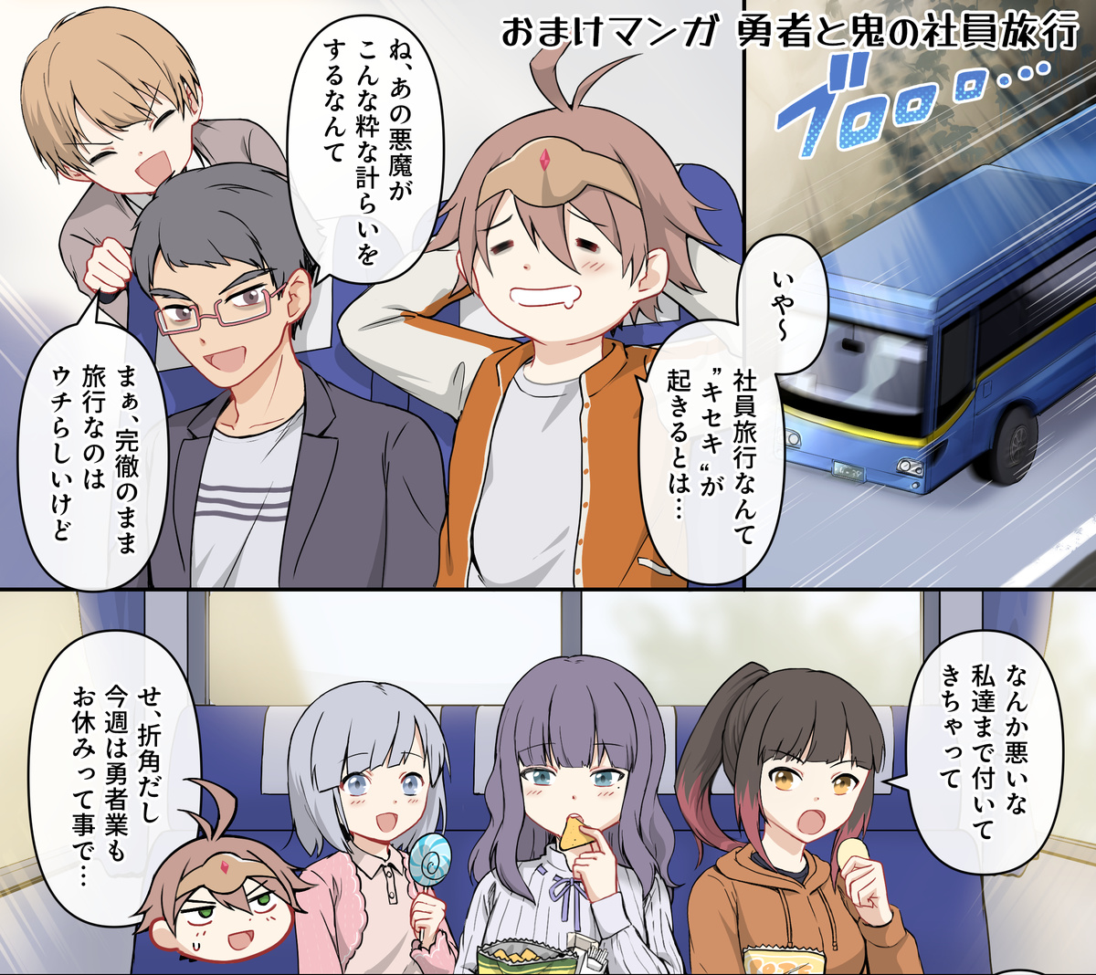 「勇者で社畜の兼業ライフ」のコミックスには、描き下ろしエピソード「勇者と鬼の社員旅行」が収録されています。「異世界で勇者」「日本で社畜」という2つの世界でそれぞれの仲間たちと奮闘するのが「勇者で社畜の兼業ライフ」の特徴ですが、特別エピソードということで日本での社員旅行ながら勇者パーティの仲間たちもかわいらしい私服で参加しています。「勇者と鬼の社員旅行」はGSCメンバー向けにも公開していますので、ぜひそちらでもチェックしてみてください。