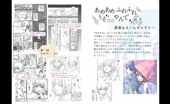 「あめあめふれふれうそやんで」のコミックスでは、本編176ページのほか、キャラクターデザインやラフイラストを集めたおまけを40ページ掲載しています。また、作品の原案からネームがどのように作られたのかを簡単な解説付きで見比べることができるギャラリーも収録されているため、より作品の魅力をじっくりと楽しむことができます。