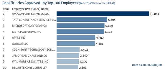 H-1Bビザへの依存度が特に高いのがテクノロジー業界です。以下は連邦政府が公開しているH-1Bビザ取得数のランキングで、1位のAmazonは2位以下に大差をつける1万件以上あるほか、Microsoft、Meta、Apple、Googleといったテクノロジー企業がそれぞれ4000人以上のH-1Bビザ労働者を抱えています。