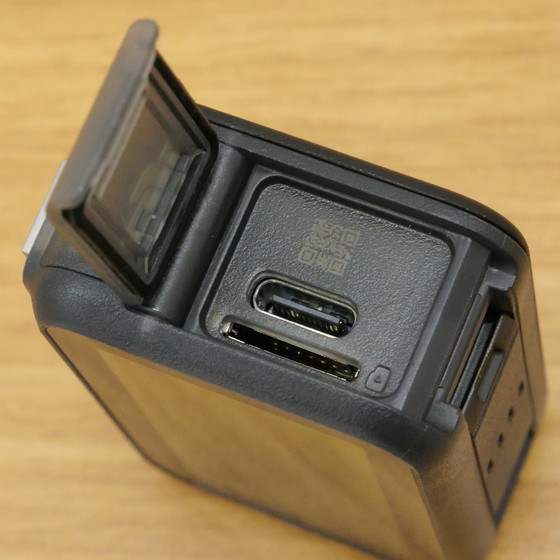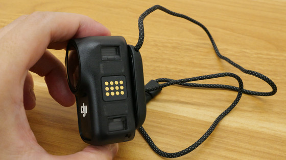 DJIのロゴが描かれている部分はフタになっており、開けると接続・充電用のUSB-Cポートと、microSDカードスロットがありました。