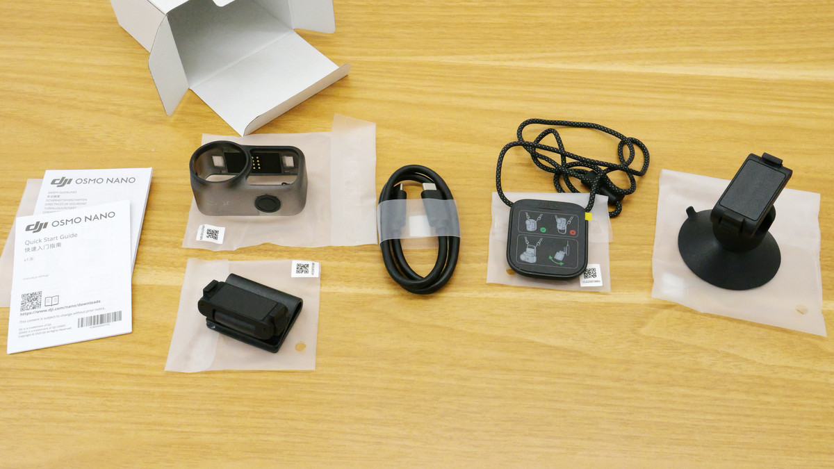内箱には、クイックスタートガイドと安全の保証、カメラの保護ケース、磁石付きのクリップマウント「マグネティックハットクリップ」、USB-Cケーブル、磁石で固定する首下げ式マウントの「マグネティックストラップ」、吸盤付きのマウント「デュアルディレクション マグネット ボールジョイント アダプターマウント」が入っていました。