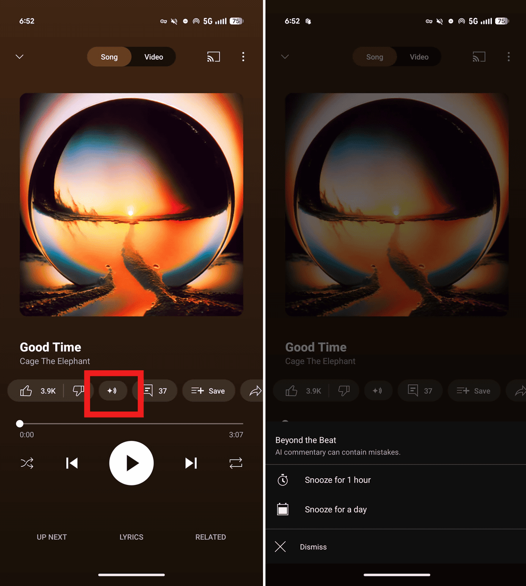 YouTube Labsで最初のテスト機能として実装されたのは、YouTube Musicの視聴体験をサポートするAIホスト「Beyond the Beat」です。以下は、GoogleやAndroid関連の情報を扱うメディアの9to5Googleが実際に試用したYouTube Musicのスクリーンショットで、曲名の下にある「グッドボタン/バッドボタン」の右側に追加されたアイコンをタップすると、Beyond the Beatが有効化されます。