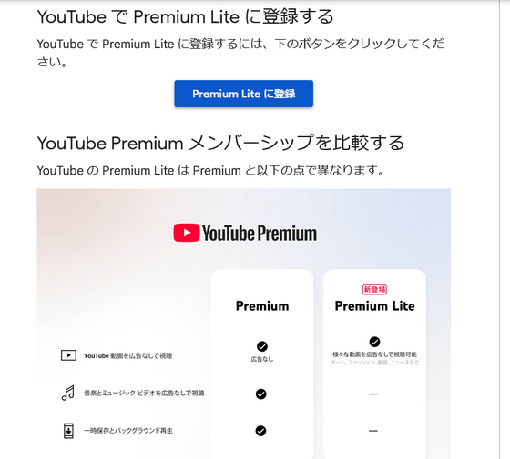 さらに、YouTube Premiumの廉価版プラン「YouTube Premium Lite」の日本向け試験提供も開始しています。YouTube Premiumは月額税込1280円ですが、YouTube Premium Liteは月額税込780円と安価な代わりに、YouTube Musicのオフライン再生やバックグラウンド再生機能といったYouTube Premiumの特典は使用できず、YouTube Premium Liteでは動画再生時の広告オフのみを利用可能です。