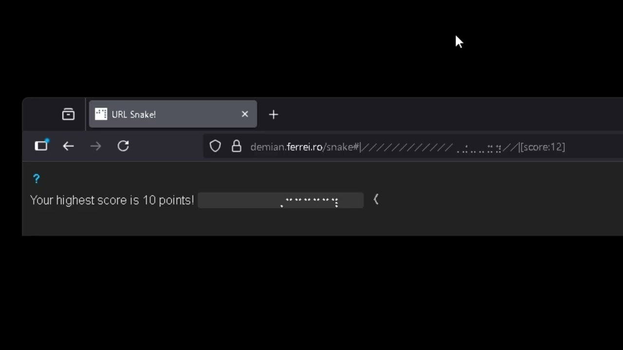 どんどんスコアを獲得していく様子は以下の動画でチェックできます。ゲーム画面がアドレスバー部分であるためプレイエリアは非常に狭く、それでいてスコアを稼ぐとスネークの体が長くなり操作し辛くなっていくため、想像以上に難度は高めでした。