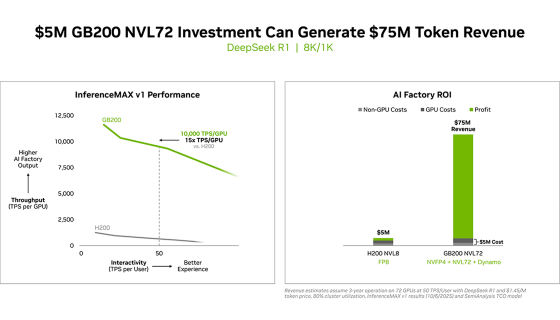 NVIDIAはInferenceMAXのリリースに合わせて公式ブログを更新し、GB200 NVL72がH200と比べて性能面とコストパフォーマンスの両面で優秀であることをアピールしています。