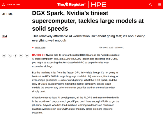 The Registerは「NVIDIAの世界最小スーパーコンピューターであるDGX Sparkは、大規模言語モデル(LLM)を安定した速度で処理できます」というタイトルでレビュー記事を公開しており、世界最速のGPUを搭載しているというわけではないものの、「すべてが十分に上手く動作する」と評しています。