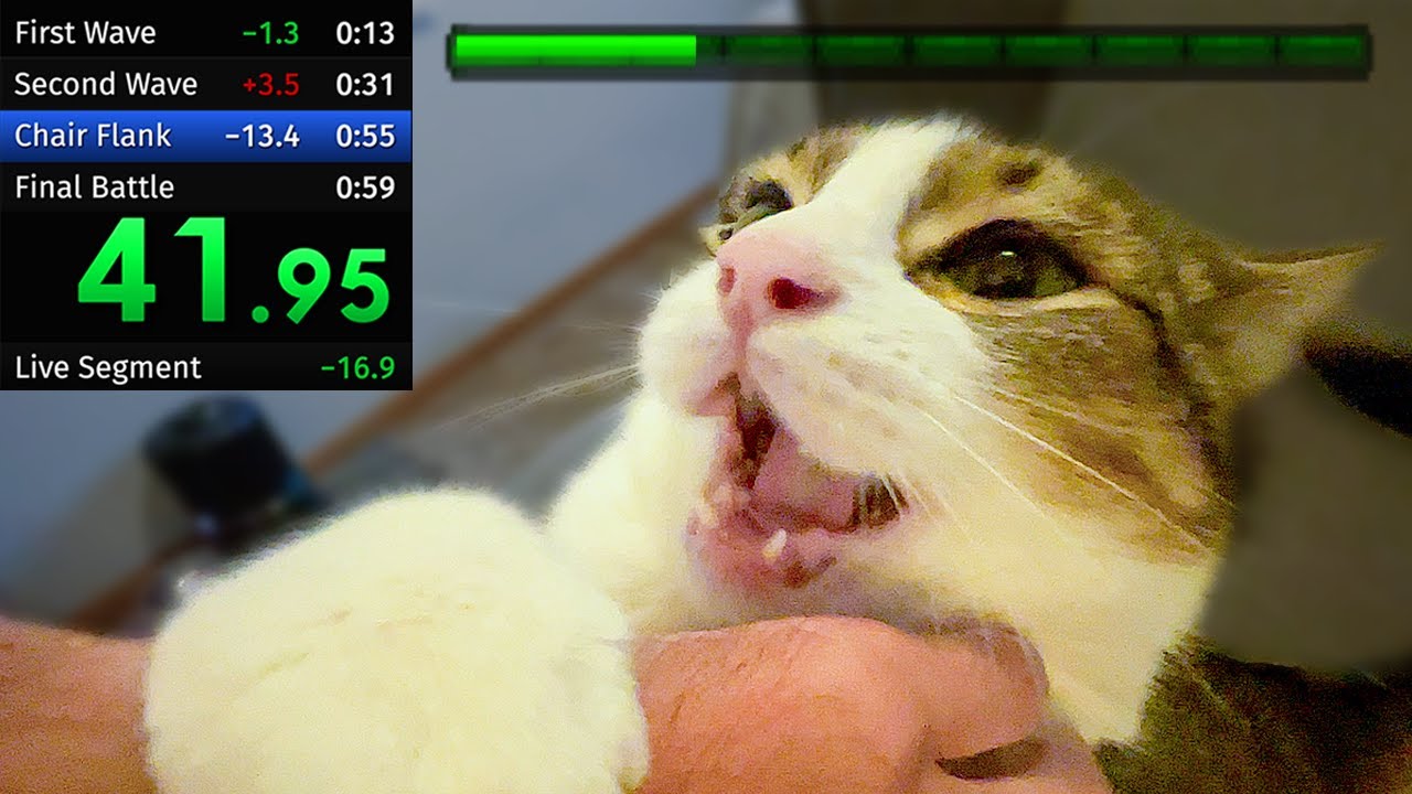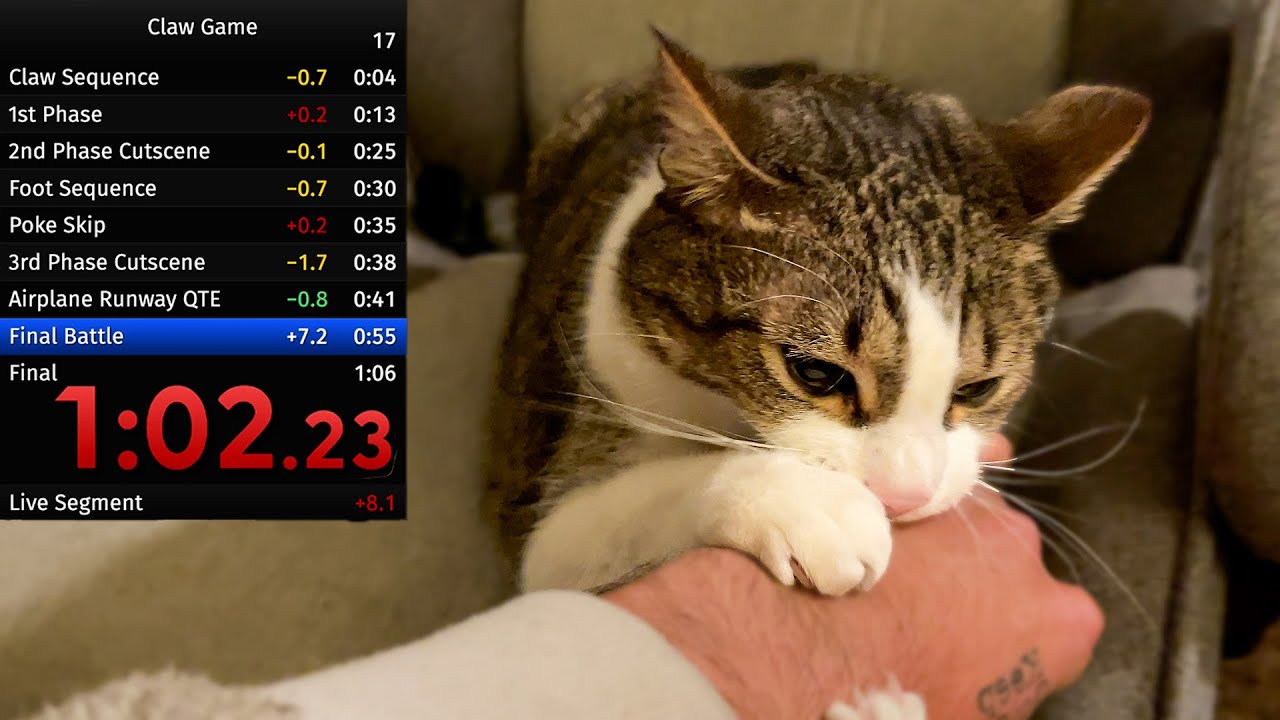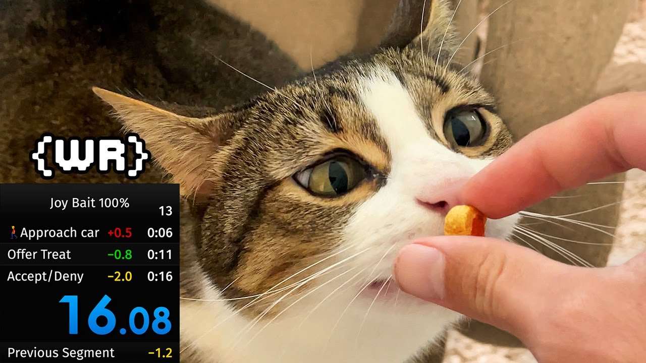 記事作成時点で最速の記録は、以下の「ネコにおやつを与えて椅子から離れさせるスピードラン(100%)」です。レギュレーションが違うため、以前の100%スピードランとは単純に比較できませんが、おやつを食べ終わったガリバーがすぐにイスから降りたことで、16秒08というany%すらも大幅に塗り替える記録がでています。