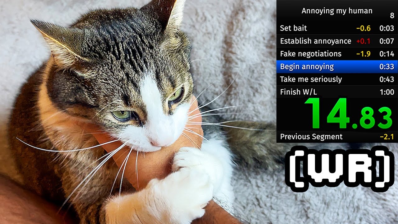 Gulliverチャンネルの最も古い投稿は「文字通り1分35秒はネコをイライラさせるだけ」というもので、ガリバーの前で指を振ったりオモチャを近づけたりして、ガリバーがイライラしたように反応する様子を撮影しています。そこから派生して、 2025年2月には「ネコがイスを離れるまでイライラさせるスピードランany%(WR)」というムービーが投稿されました。以前にも「ネコが椅子を放棄するまでイライラさせる」という動画はありましたが、そこにタイマーを配置してスピードラン形式にしています。なお、「any%」というのはゲームのスピードランで使われる用語で、ゲームのアイテムやステージの要素を全て回収してクリアする「100%」ではなく、とにかくゲームの達成率を気にせず最速でクリアするというレギュレーションです。
