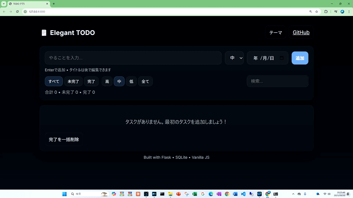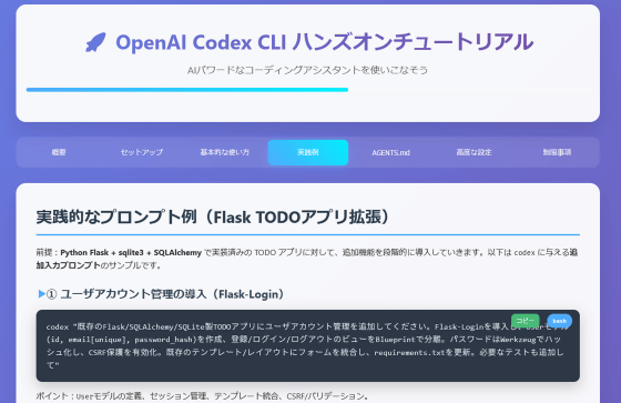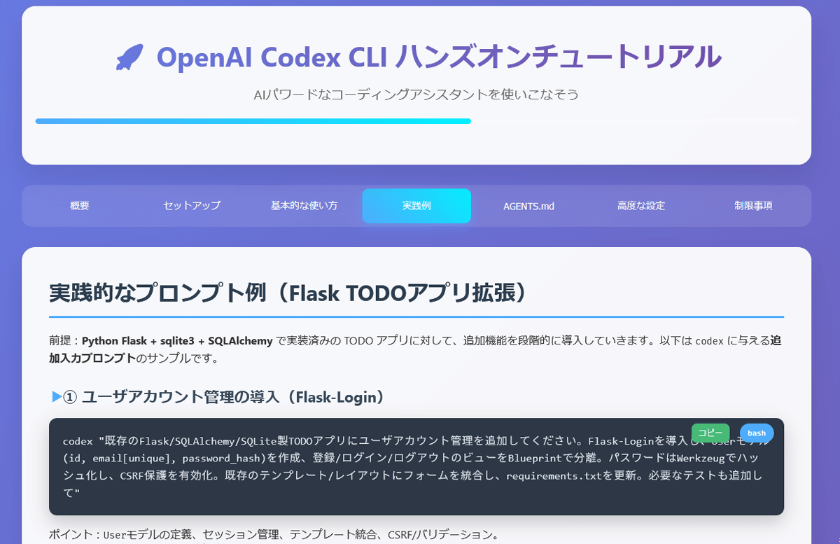Codexの基本的な使い方を学びつつ、「Codexを用いてToDoアプリを短時間で自動開発する」という操作を体験可能。成果物を即座に確認できるので、達成感を味わいつつ学習を進められます。