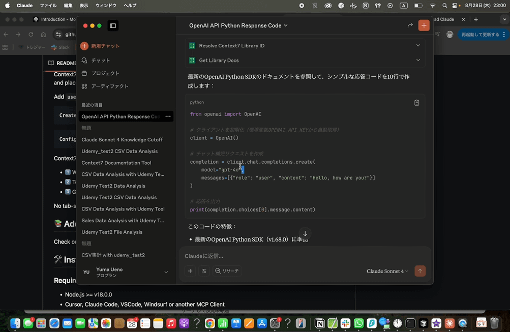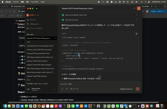 「Claude Desktop」と各種ドキュメントの最新情報を読み込めるMCPサーバー「Context7」を連携させる実例も見せてくれます。AIは古い情報を参考にした解答を出力してしまうことがありますが、Claude DesktopとContext7を連携させることで最新情報に基づいた解答を出力してくれるようになります。