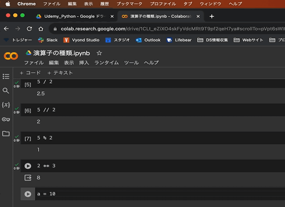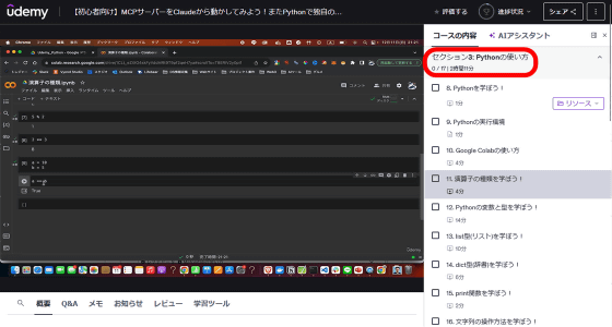 講座はPythonの入門コースから始まります。簡単な四則演算の解説から始まるため、プログラミング未経験者でも問題なく学習を進めることができます。この講座でもColaboratoryを使うため、面倒な環境構築は不要ですぐに学習を始められます。