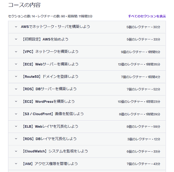 講座に含まれるコース一覧が以下。「VPC」「EC2」「Route53」「RDS」「EC2」「S3」「ELB」「CloudWatch」「IAM」といったAWSの主要サービスの使い方を学べます。
