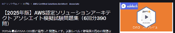 UdemyにはAWSについて詳しく解説する講座が複数ラインナップされているほか、「AWS 認定ソリューションアーキテクト – アソシエイト」に合格するための問題集もあります。