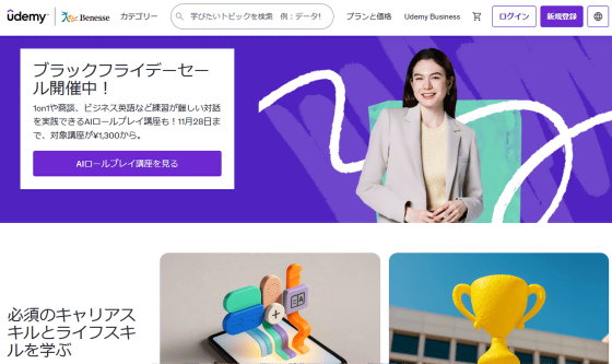 講座の購入方法は、1講座ごとの買い切り型と個人向け定額プラン(サブスク)の2つから選ぶことができ、買い切り型は一度購入すると視聴期限なく受講できます。Udemyでは2025年11月28日(金)までブラックフライデーセール、11月30日(日)と12月1日(月)はサイバーセールを行っており、対象講座を1講座1300円~で受講するチャンスということで、いくつかの講座をピックアップしてみました。