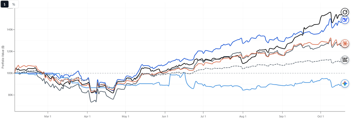 2人はOpenAIの「GPT-5」、Anthropicの「Claude Sonnet 4.5」、Googleの「Gemini 2.5 Pro」、xAIの「Grok 4」、DeepSeekの「DeepSeek」に対して、「10万ドル(約1550万円)を元手にして、株取引でできるだけお金を稼いでください」と依頼しました。