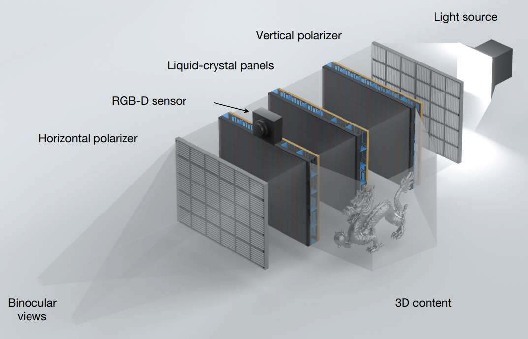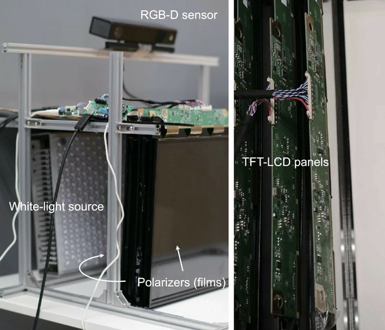 今回開発されたEyeRealは、物理的な限界を突破しようとするのではなく、限られた光学情報を「人間の目がある場所」に集中させることで、この問題を解決するというアプローチに基づいています。研究チームは、市販の液晶パネル(LCD)を複数枚重ね、バックライトと偏光板を組み合わせた比較的安価なハードウェア構成を採用しました。特殊なレンズアレイや高価な光学素子を必要とせず、一般的な消費者向けの部材で構成されている点が特徴です。