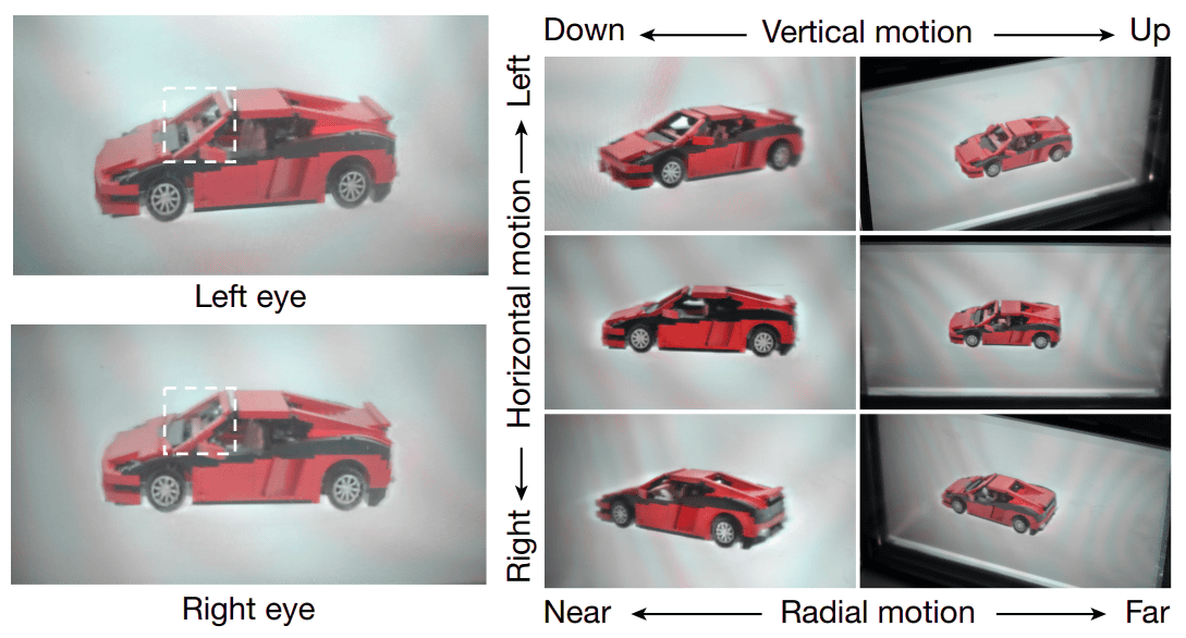 この技術によってEyeRealは、100度を超える超広角な視野と解像度1920×1080ピクセルの両立に成功しましたとのこと。実験では、複雑な都市景観や日常的な物体などの3Dコンテンツを用いて検証が行われ、観察者は水平・垂直・前後のどの方向に動いても、途切れることのない滑らかな運動視差を体験できたとのこと。さらに、焦点距離に応じたボケ味を再現する「焦点調節」にも対応しており、従来のVR/AR機器で問題となっていた、目のピント調節や向きの不一致による不快感を軽減する効果も示されています。